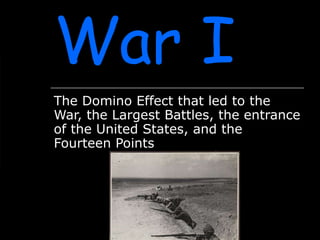 World War I began after the assassination of Archduke Franz Ferdinand led Austria-Hungary to declare war on Serbia. This caused countries to take sides and enter the war through a series of alliances, with the Central Powers of Germany, Austria-Hungary and the Ottoman Empire fighting against the Allied Powers including Britain, France, Russia and later the United States. Major battles included the Battle of the Marne in 1914 where Germany failed to capture Paris, and the Battle of the Somme in 1916 which was the bloodiest day for Britain. The United States entered the war in 1917 after German U-boats attacked American ships, and launched a major offensive in 1918 that helped turn the tide in favor of the Allies
