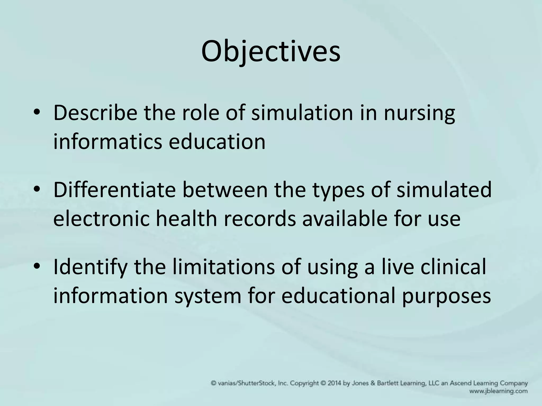 This document discusses the use of simulation in nursing informatics education. It describes how simulated electronic health records (EHRs) can be incorporated into nursing education to allow students to actively use informatics in a realistic learning context. There are two main approaches: EHRs created specifically for simulation or using a real EHR system from a healthcare facility or vendor. The document outlines challenges and opportunities to further integrate informatics tools into education to better prepare nursing students.