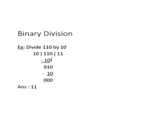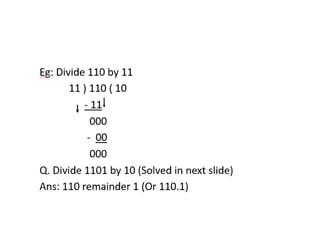 The document discusses various number systems including decimal, binary, octal, and hexadecimal, highlighting their bases, symbols, and conversions. It explains how to represent signed numbers using different methods such as signed magnitude, 1's complement, and 2's complement, along with techniques for converting between bases. Additionally, it covers concepts of positional versus non-positional number systems, and includes examples of arithmetic and conversions.