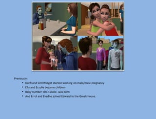 Casanunda passes away at a family party celebrating the birthdays of Errol and Eulalie. Before his death, Casanunda makes sure to spend time with each family member. At the party, Errol becomes a teen interested in studying everything, while Eulalie grows into a bouncy toddler. Dorfl then talks to Edward about the possibility of becoming the family heir, which would involve Dorfl's experimental research into allowing Edward and his partner Dorian to have children through a complex and difficult medical process. Edward says he needs time to consider the responsibility and discuss it with Dorian.