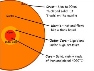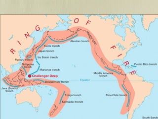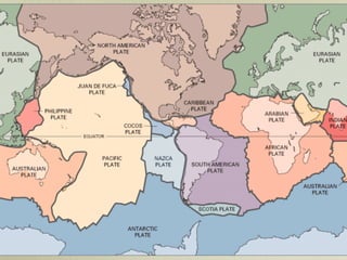The document discusses plate tectonics and the evidence that supports continental drift. It explains that continents move as parts of tectonic plates, and describes the three types of plate boundaries: constructive where plates diverge, destructive where they converge, and conservative where they slide past each other. Examples are given of associated geological features like mid-ocean ridges, trenches, volcanoes and mountains. The movement of plates causes earthquakes and shapes the Earth's surface over time.