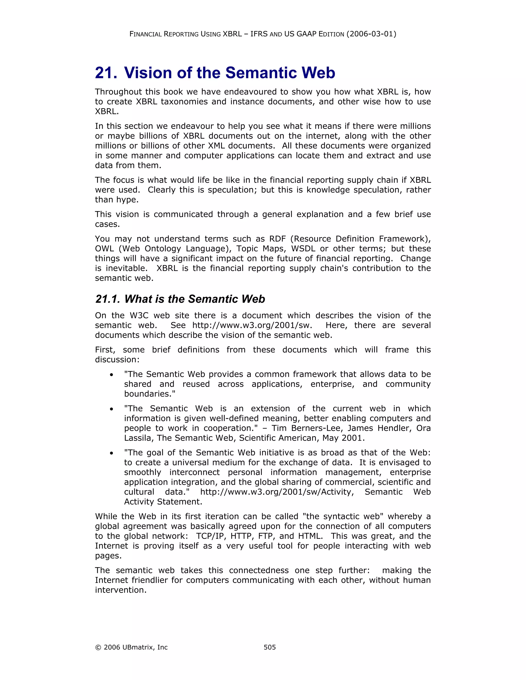 The document discusses the vision of the semantic web and how it could impact financial reporting if XBRL was widely used. It describes how the semantic web allows data to be shared and reused across applications and boundaries, enabling computers and people to work together. It provides several potential use cases, such as enabling real-time reporting and audits, more efficient loan applications that use electronic financial reports submitted every 30 days instead of quarterly paper reports, and intelligent agents that can identify promising investment opportunities. Finally, it discusses the concept of "extreme financial reporting", which would be driven by business rules compliance, embrace a single set of global accounting standards (IFRS), and involve accounting standards being expressed in XBRL taxonomies before they
