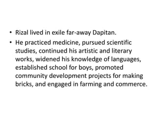Rizal lived in exile in Dapitan from 1892-1896. During this time, he practiced medicine, pursued scientific studies, continued his artistic and literary works, taught boys at the school he established, and engaged in community development projects like brick making and farming. He had a largely peaceful life, but had some disputes with local friars and businessmen. Rizal contributed greatly to the community through his various pursuits and projects.