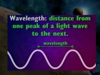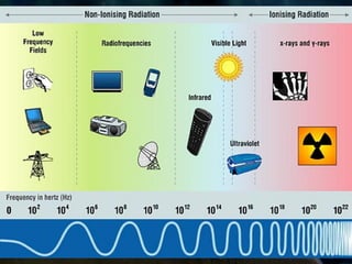 The document provides an overview of radiation from space and the electromagnetic spectrum. It discusses how electromagnetic waves, including visible light, travel from stars and other celestial objects and can provide information about their sources. Telescopes are instruments that can be used to observe electromagnetic radiation, with optical telescopes using lenses and mirrors to collect visible light, and radio telescopes detecting radio waves. The document outlines different types of telescopes and regions of the electromagnetic spectrum, from radio waves to gamma rays.