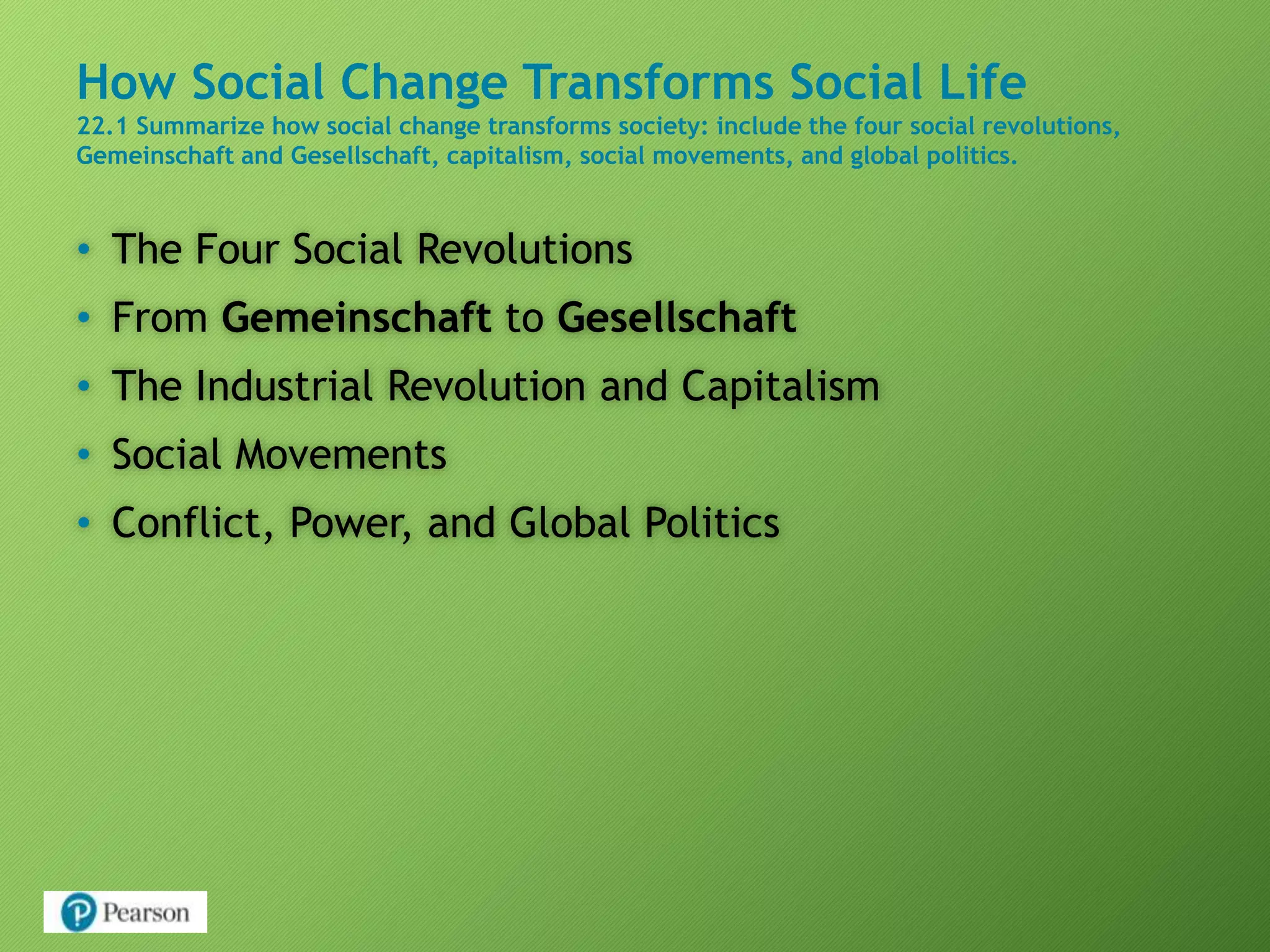The document discusses how social change transforms society through four major revolutions: from hunting and gathering to agriculture, the agricultural revolution, the industrial revolution, and the digital revolution. It also discusses the transition from gemeinschaft to gesellschaft societies, the rise of capitalism during the industrial revolution, social movements as agents of change, and how conflict and global politics drive social change. New technologies like the automobile and microchip are highlighted as transforming work, family, education and causing social inequality. Environmental problems resulting from industrialization and the need for environmental protection through sustainable development are also summarized.