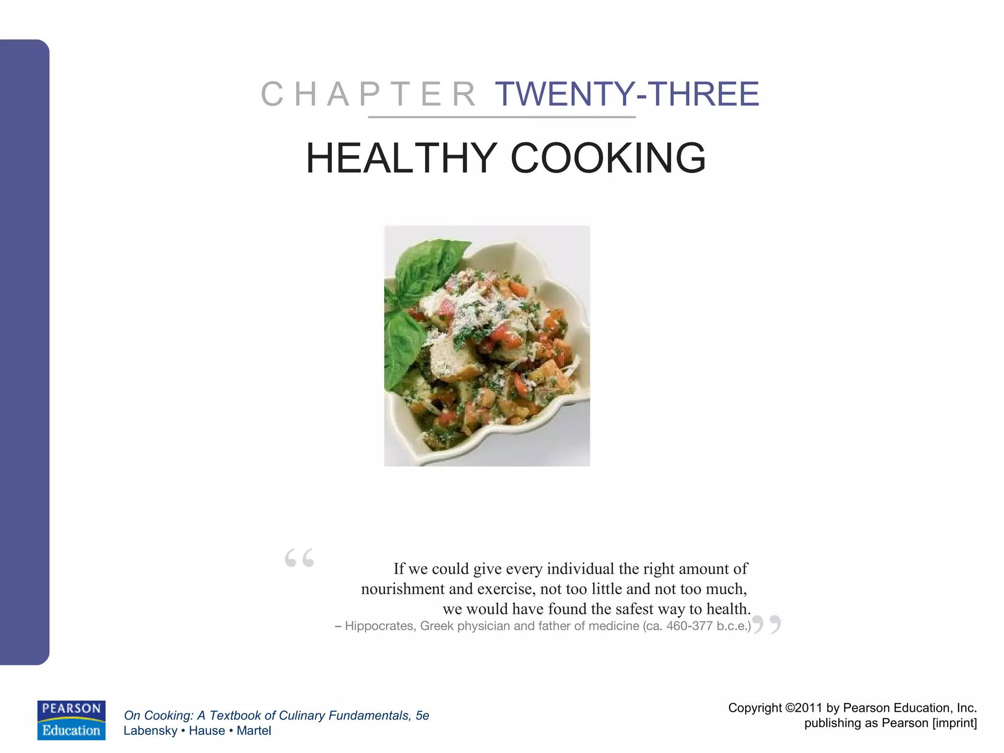 The document discusses healthy cooking and nutrition. It covers the six categories of nutrients, including macronutrients like carbohydrates, lipids and proteins that provide calories, and micronutrients like vitamins and minerals that are needed in smaller amounts. It also discusses tools for planning a healthy diet, such as the USDA's MyPyramid and nutrition labels. The document emphasizes using ingredients substitutes and preparing foods in ways that preserve nutrients.