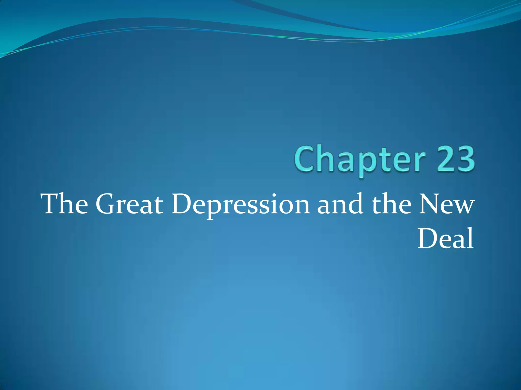 The document provides details about life in the United States during the Great Depression from 1929 to 1933. It describes how the stock market crash led to widespread unemployment that reached 25% as many industries declined. President Hoover initially responded through voluntary programs but the economic situation continued to deteriorate. When Franklin Roosevelt became president in 1933, he worked with Congress to pass New Deal programs that focused on relief, recovery, and reform. The New Deal provided jobs through programs like the CCC and WPA and sought to reform the financial system through agencies and acts. However, the Depression had severe impacts and the New Deal faced obstacles from the Supreme Court and other critics.