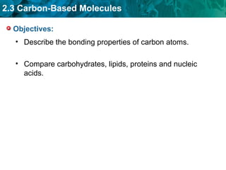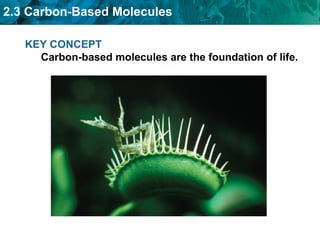 Carbon-based molecules like carbohydrates, lipids, proteins, and nucleic acids are the foundation of life. They have unique structures and functions. Carbohydrates include sugars and starches that can provide energy or be part of cell structure. Lipids include fats, oils, and phospholipids that form cell membranes and can also provide energy. Proteins are made of amino acids linked through peptide bonds and perform important functions like movement and chemical reactions. Nucleic acids like DNA and RNA store genetic information and build proteins.