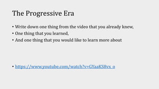 The Progressive Era saw rising inequality and wealth disparity in the late 19th/early 20th century America. Reform movements emerged seeking to address economic and social issues through government action. Progressives implemented various reforms at local and state levels, including restructuring municipal governments, establishing direct primaries, and granting citizens more direct democratic powers like initiative and referendum. Federal reforms followed, such as the Pure Food and Drug Act, in response to muckraking journalism that investigated corporate abuses and unsanitary conditions.