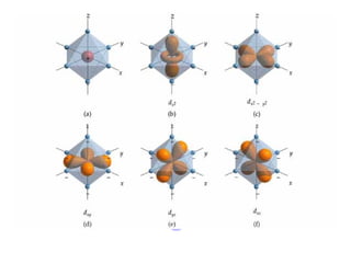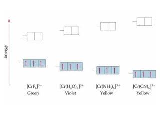 This document discusses coordination chemistry and transition metals. It begins by explaining why transition metals are important to study, as they are found in nature and have many applications. It then discusses the electronic configurations of transition metals and how they can exist in multiple oxidation states. The focus is on coordination complexes formed when transition metals act as Lewis acids and bond to other ligands. Different types of ligands are described along with common coordination geometries. Rules for naming coordination compounds according to IUPAC nomenclature are also provided.
