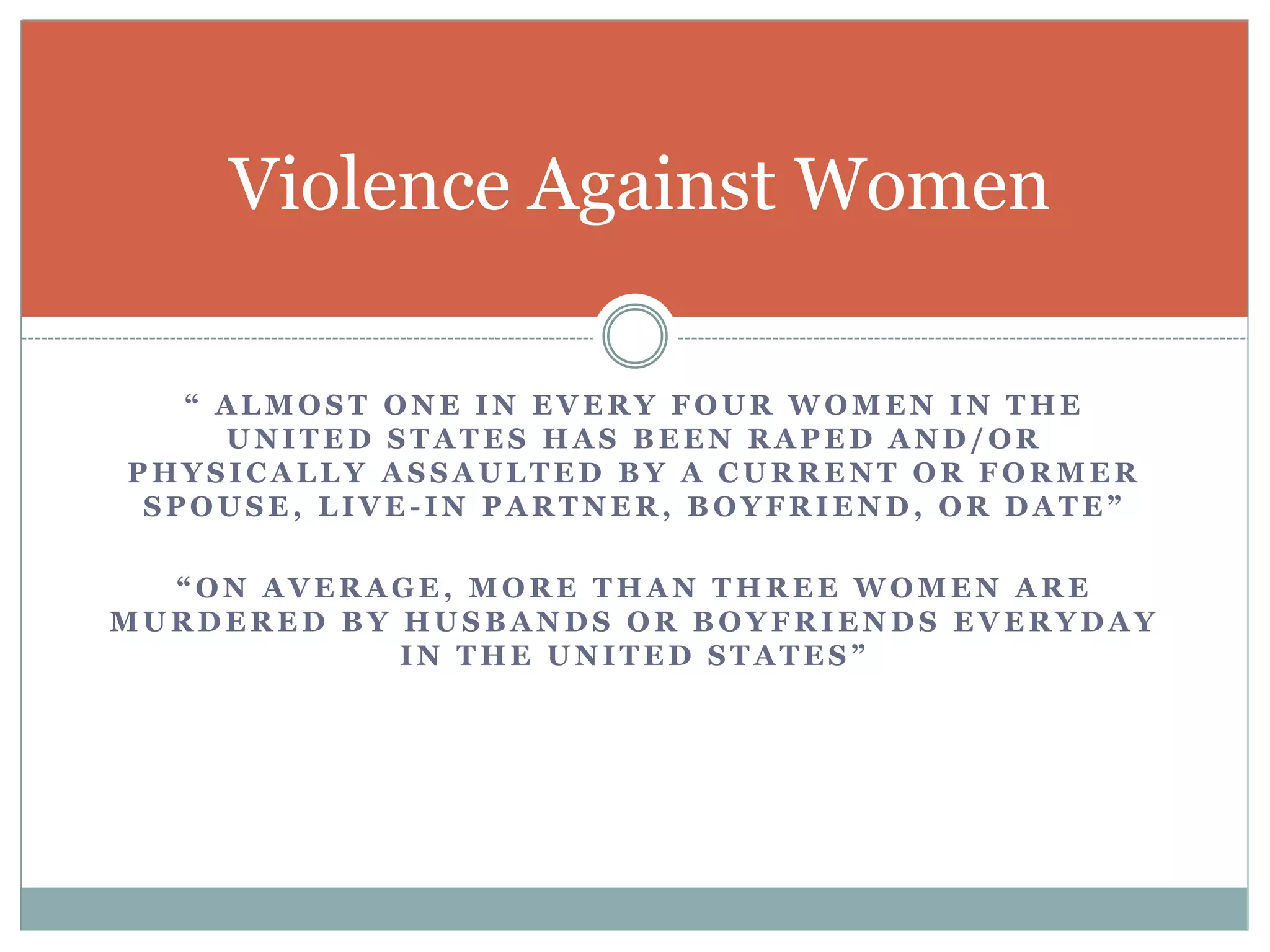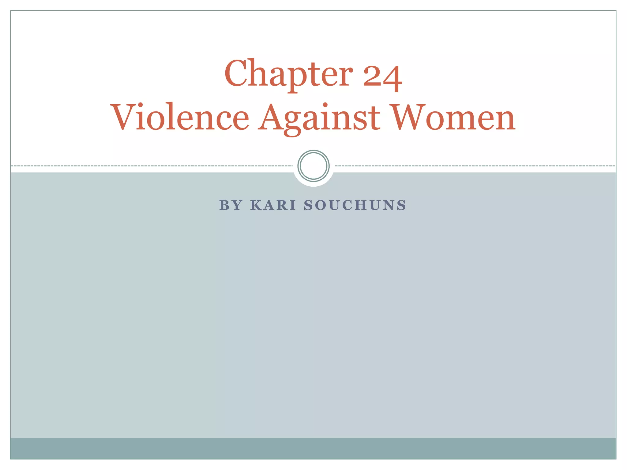This document discusses violence against women, including statistics showing that 1 in 4 women in the US have experienced rape or physical assault. It covers different types of violence like intimate partner violence, rape, stalking, and abuse of children and adolescents. Contributing factors include cultures that assign superiority to men and issues like isolation, mental health problems, and substance abuse. The document provides information on medical considerations after rape, safety planning, and ending violence through education, intervention, and community support.