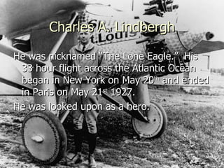 Charles Lindbergh was hailed as a hero for his 33-hour solo transatlantic flight from New York to Paris in 1927. Installment plans and consumerism boomed in the 1920s as Americans had more disposable income. A few large firms dominated many industries such as steel and electricity through oligopolies. The stock market crashed in October 1929 after prices had soared in 1928, plunging on Black Thursday and Black Tuesday in particular.