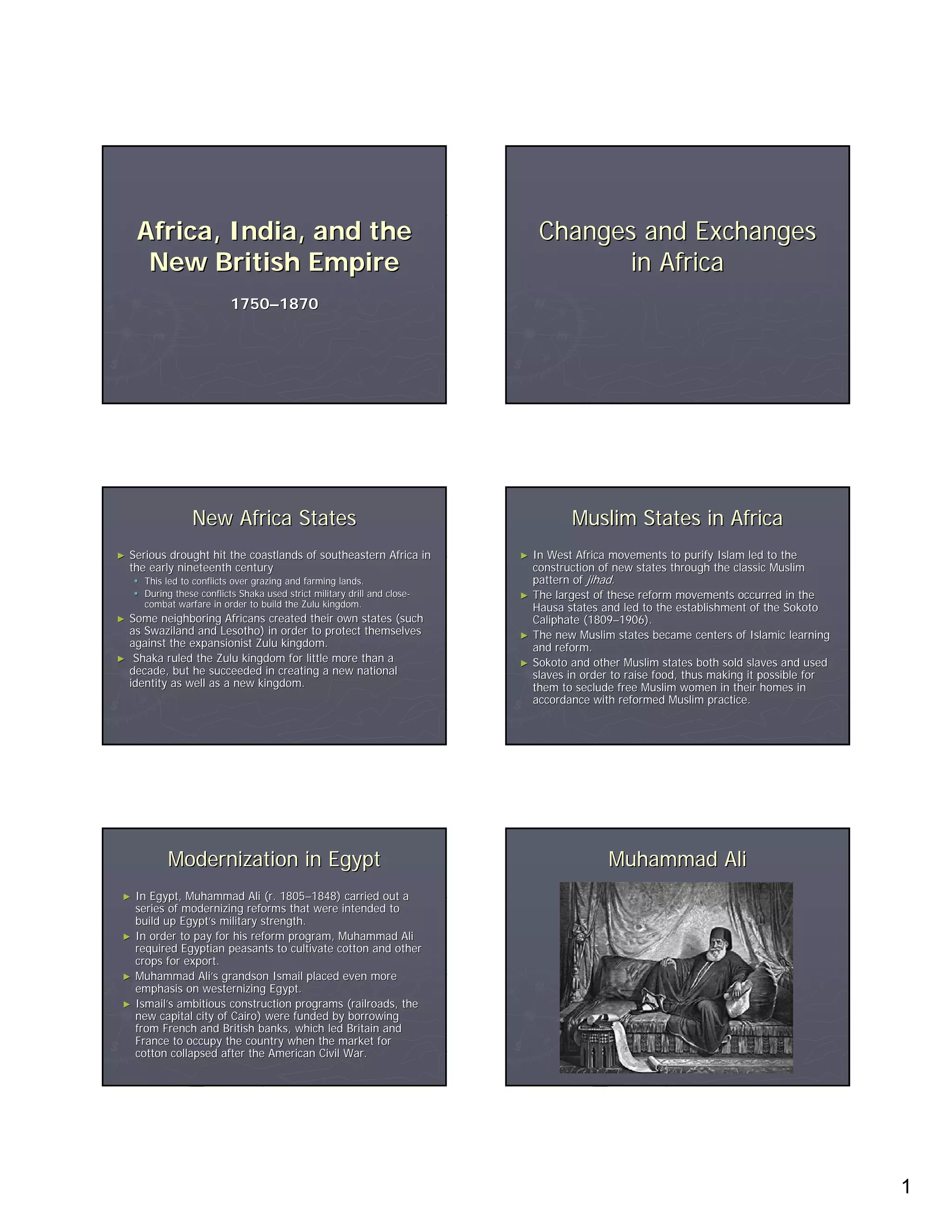 The document discusses changes and exchanges in Africa between 1750-1870, including the establishment of new states in Africa, Muslim reform movements in West Africa that led to new states like the Sokoto Caliphate, modernization efforts in Egypt under Muhammad Ali, European exploration of Africa's rivers, abolition of the slave trade, growth of legitimate trade, expansion of palm oil exports, development of secondary empires based on the ivory and slave trades, and British rule over India through the East India Company.