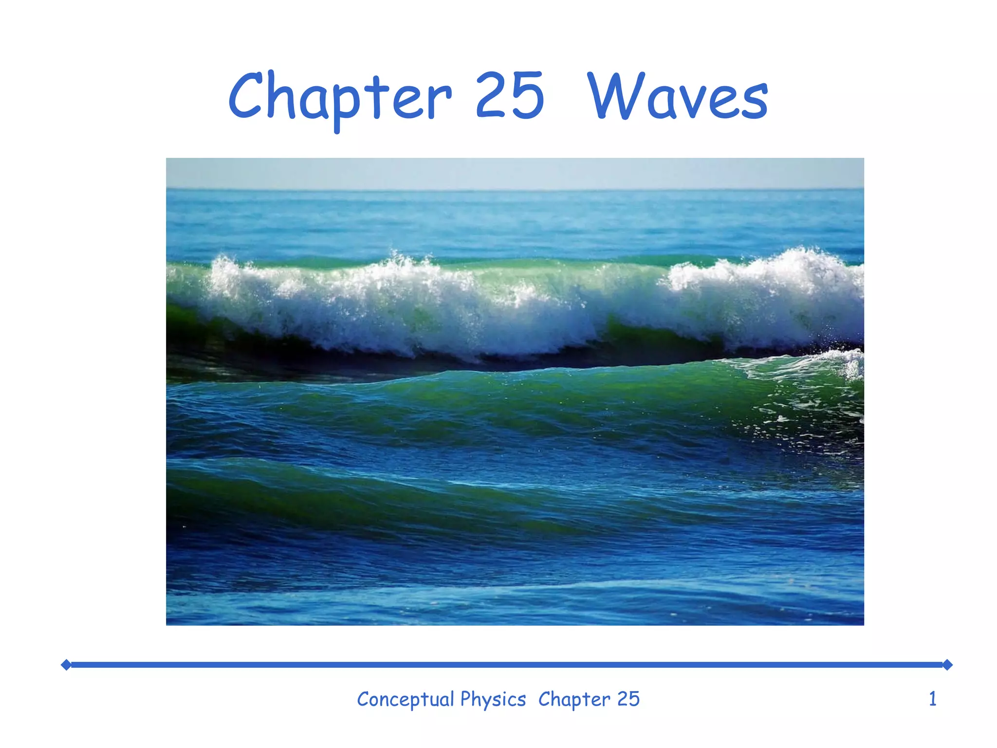This chapter discusses different types of waves including transverse, longitudinal, and surface waves. It describes the properties of waves like amplitude, wavelength, frequency, and speed. It explains various wave phenomena such as interference, standing waves, and the Doppler effect including how shock waves are formed when the source moves faster than the wave speed.