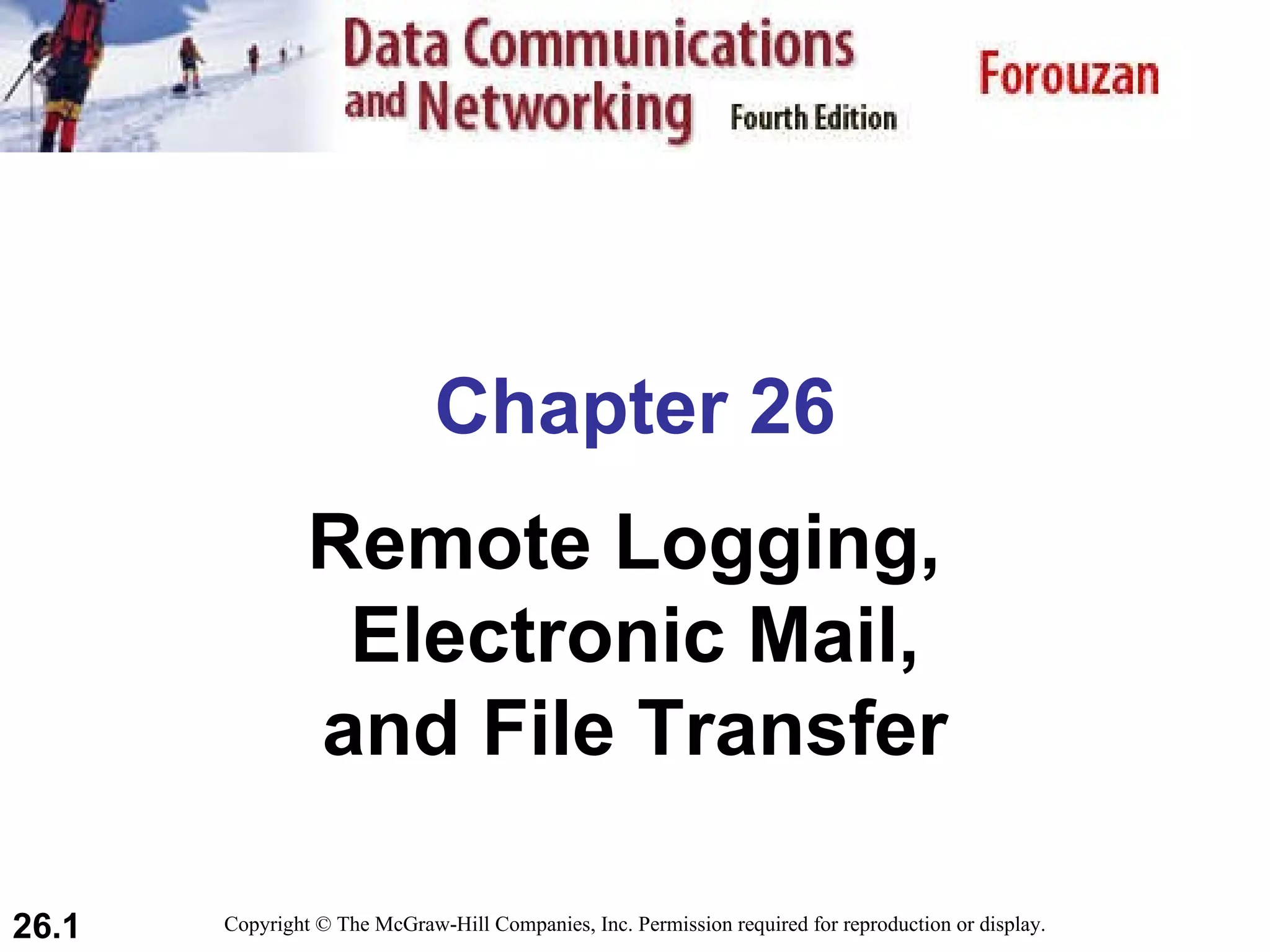 TELNET is a general-purpose client/server application that allows users to access applications on remote computers. Electronic mail is one of the most popular Internet services, using user agents, message transfer agents, and message access agents. File Transfer Protocol (FTP) allows transferring files between computers using separate TCP connections for control commands and data transfer.