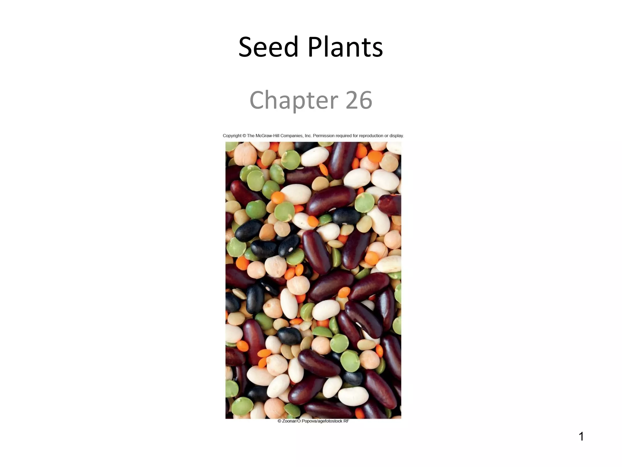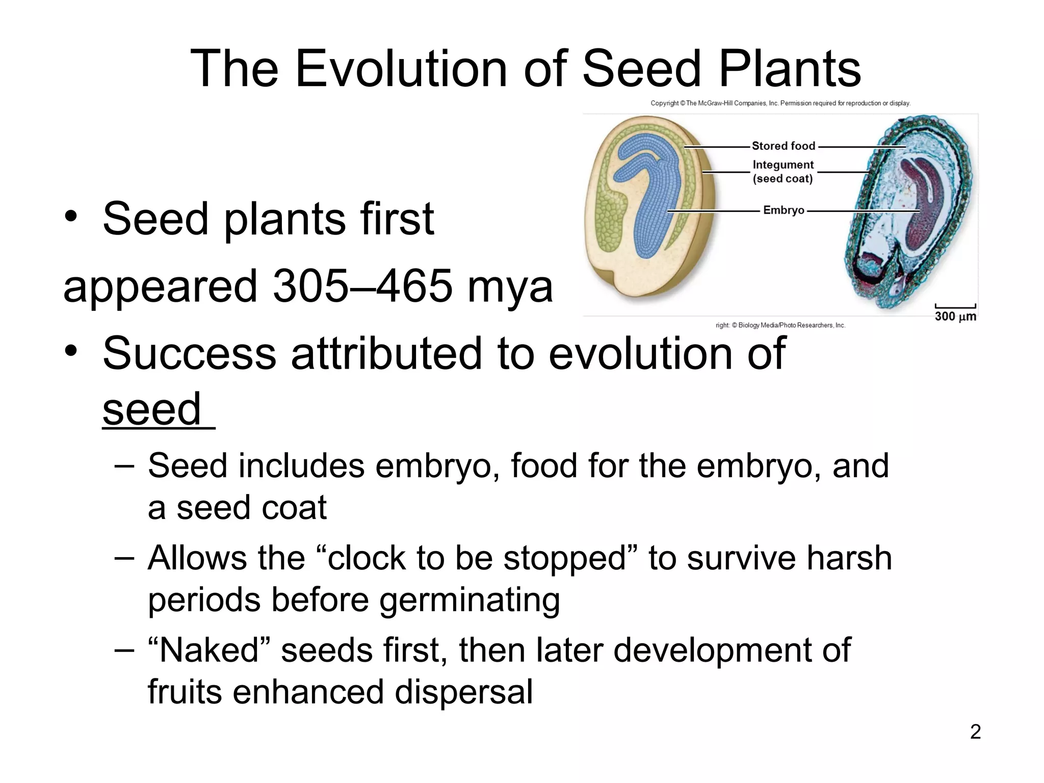 Seed plants first appeared 305-465 million years ago and their success is attributed to the evolution of seeds. Seeds include an embryo and food to allow the embryo to survive harsh periods before germinating. There are five phyla of extant seed plants: coniferophyta, cycadophyta, gnetophyta, ginkophyta, and anthophyta. Angiosperms are the most diverse and include flowering plants whose ovules are enclosed in carpels and develop into fruits after fertilization.