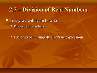 This document discusses division of real numbers. It defines division as multiplying by the reciprocal. It provides examples of dividing numbers and simplifying expressions using division. It also discusses properties of division including that the quotient of numbers with the same sign is positive and opposite signs is negative. It cannot divide by zero since zero has no reciprocal. An example problem calculates velocity by dividing distance by time.