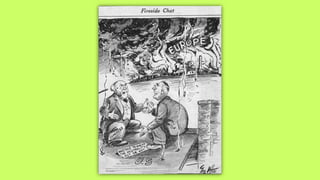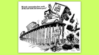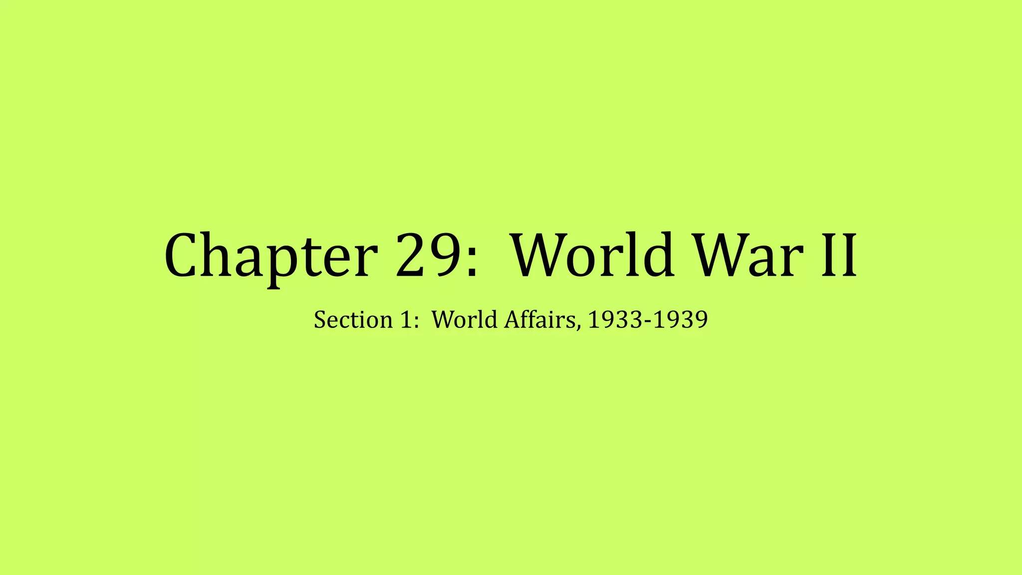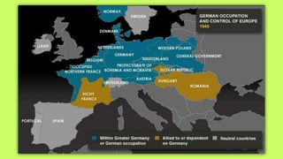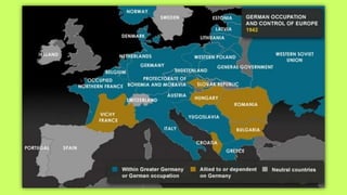 Roosevelt worked to improve foreign relations and adopt an isolationist stance in the 1930s as countries like Germany and Japan rose in power and aggression. As World War II began in Europe in 1939, Roosevelt provided some aid to Britain and France while maintaining official neutrality, though he recognized the threat posed by the Axis powers. By 1940, with Germany occupying much of Europe and threatening Britain, Roosevelt began abandoning the neutrality stance and provided more direct aid, seeing America's involvement as necessary to defend democracy.