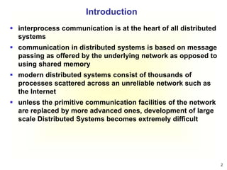 This document discusses communication in distributed systems and introduces several communication models. It begins by explaining that communication in distributed systems is based on message passing rather than shared memory. It then reviews four common communication models: Remote Procedure Call (RPC), Remote Method Invocation (RMI), Message-Oriented Middleware (MOM), and Streams. The document also discusses layered protocols like OSI and TCP/IP, and delves into specifics of RPC including parameter passing and extended RPC models like asynchronous RPC and doors.