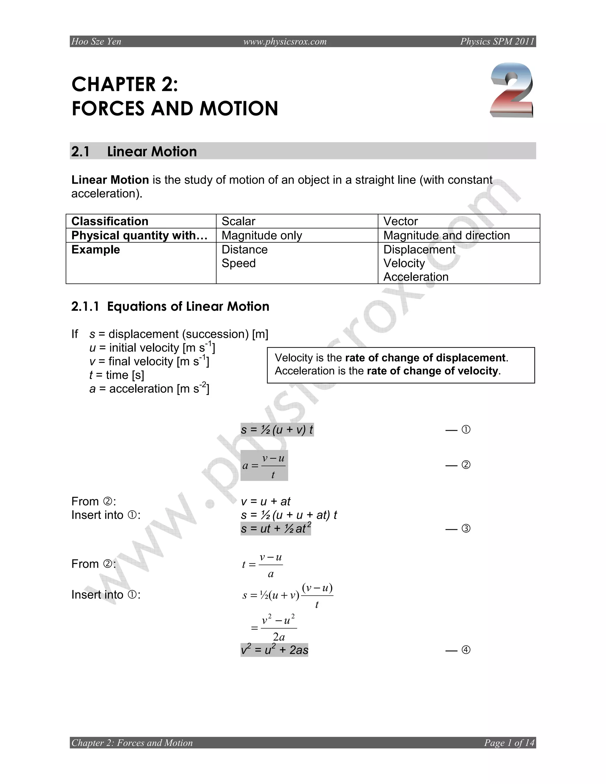 1) Equations for linear motion including displacement, velocity, acceleration, and kinematic equations.