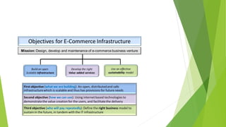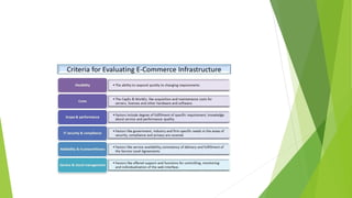 The document discusses the key components of e-commerce infrastructure. It begins by defining e-commerce infrastructure and noting that the right infrastructure is important for business performance. It then categorizes infrastructure into the e-commerce environment, infrastructure services, and e-commerce solution providers. Various software and hardware components used in e-commerce infrastructure are outlined. The document also discusses the importance of infrastructure components, objectives for e-commerce infrastructure, criteria for evaluating infrastructure, and performance models associated with infrastructure.