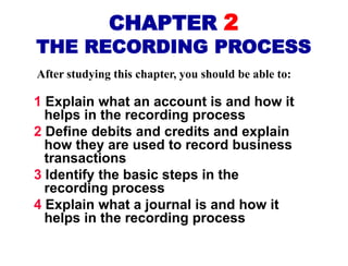 The document discusses the recording process in accounting. It covers key concepts like accounts, debits and credits, journals, ledgers, and posting. It explains that accounts track increases and decreases to specific items, and that debits and credits are used according to rules to record transactions. Journal entries are made for each transaction and then posted to ledger accounts to update balances. The steps of journalizing, posting, and preparing a trial balance are important parts of the recording process.