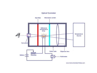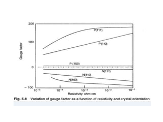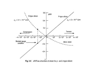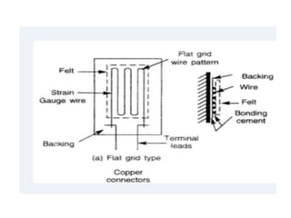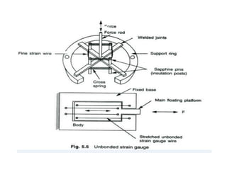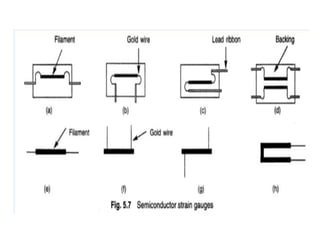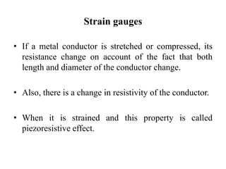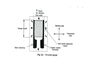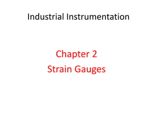 This document discusses strain gauges used in industrial instrumentation. It describes the different types of strain gauges including electrical, mechanical, and optical gauges. Within electrical gauges, it focuses on wire, foil, semiconductor, and thin film gauges. It explains the theory of operation of resistance strain gauges and factors that affect strain gauges such as temperature, creep, linearity, and bonding techniques. Temperature compensation methods are also summarized.