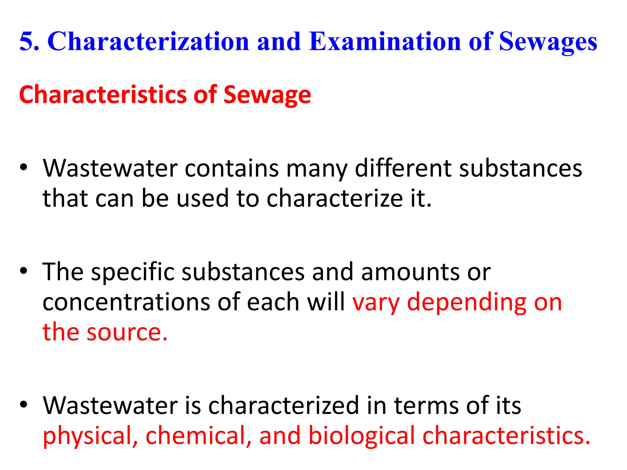 - The document describes the characterization of sewage based on its physical, chemical, and biological properties.