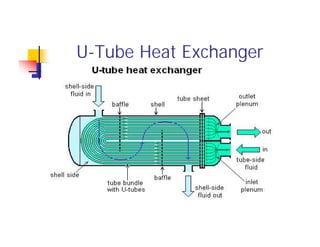 The document discusses shell and tube heat exchangers. It describes the different types of shell and tube designs according to the TEMA standard, including U-tube, straight tube, and kettle-type designs. It also discusses design considerations for different components like stationary heads, rear ends, baffles, tubesheets, and joints. The TEMA standard provides terminology for naming heat exchangers based on these design features and components.