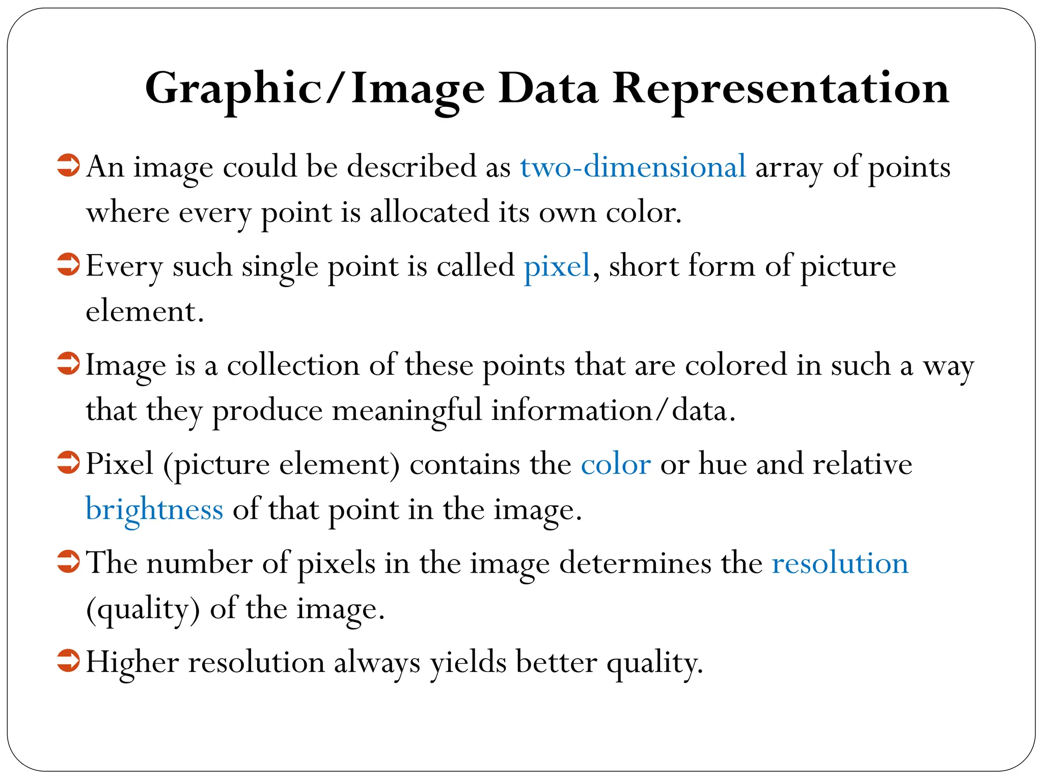 The document provides a comprehensive overview of graphic and image data representation, explaining key concepts such as pixels, bitmap, and vector graphics, along with their respective advantages and disadvantages. It discusses the technical aspects of digital images, including resolution, color depth, and various image file formats like GIF, JPEG, and PNG, emphasizing their use cases and compression techniques. Additionally, it covers color models in imaging, the relevance of text in multimedia, and offers guidelines for selecting text fonts to enhance readability and branding.