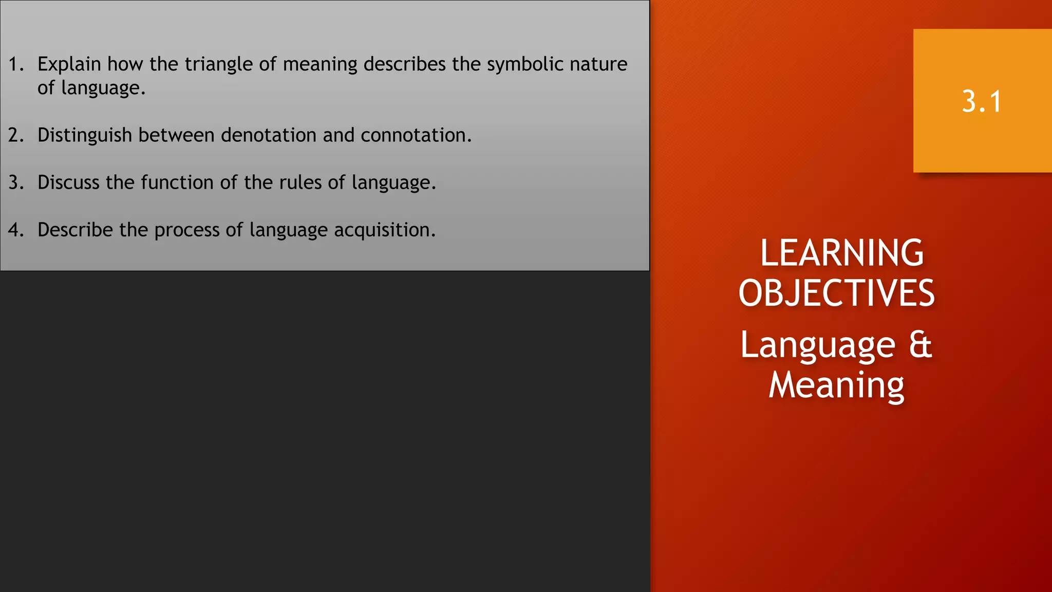 This document outlines the learning objectives for four sections on language: Language & Meaning, Functions of Language, Using Words Well, and Language, Society & Culture. The objectives cover topics such as the symbolic nature of language, denotation vs connotation, language acquisition, the power of language to express identity and control others, neologisms and slang, social norms in conversation, cultural variations in language, and cultural bias.