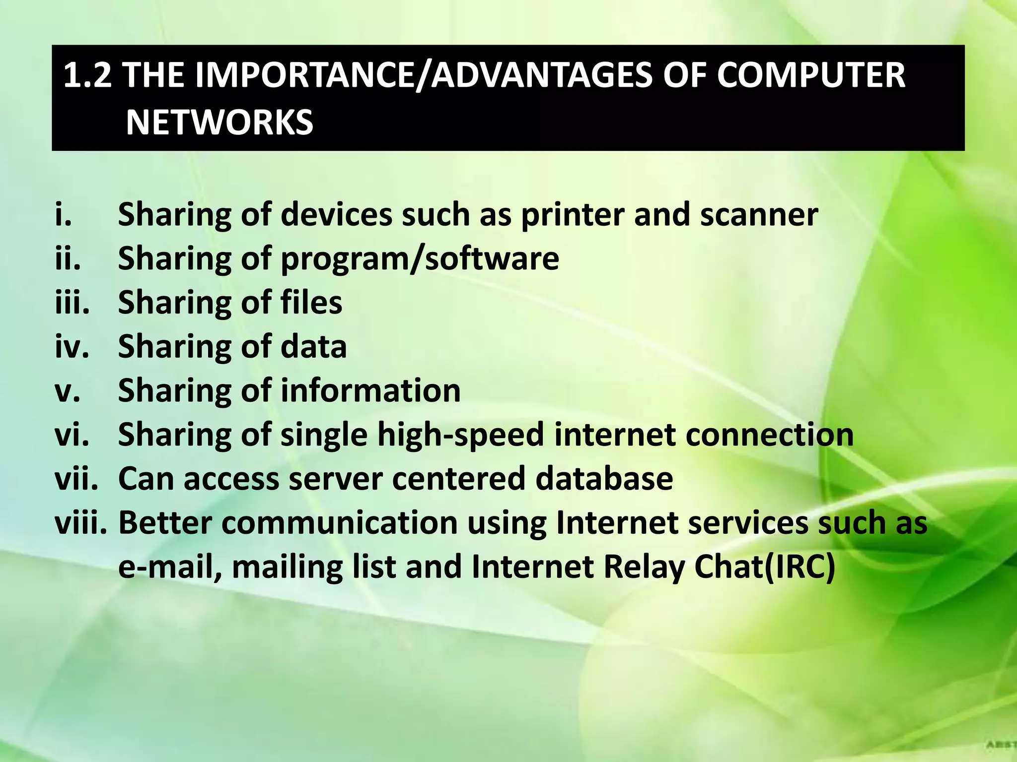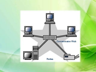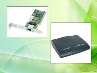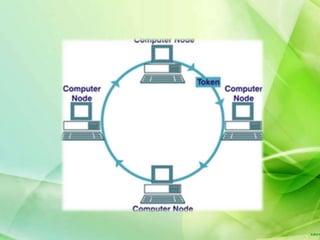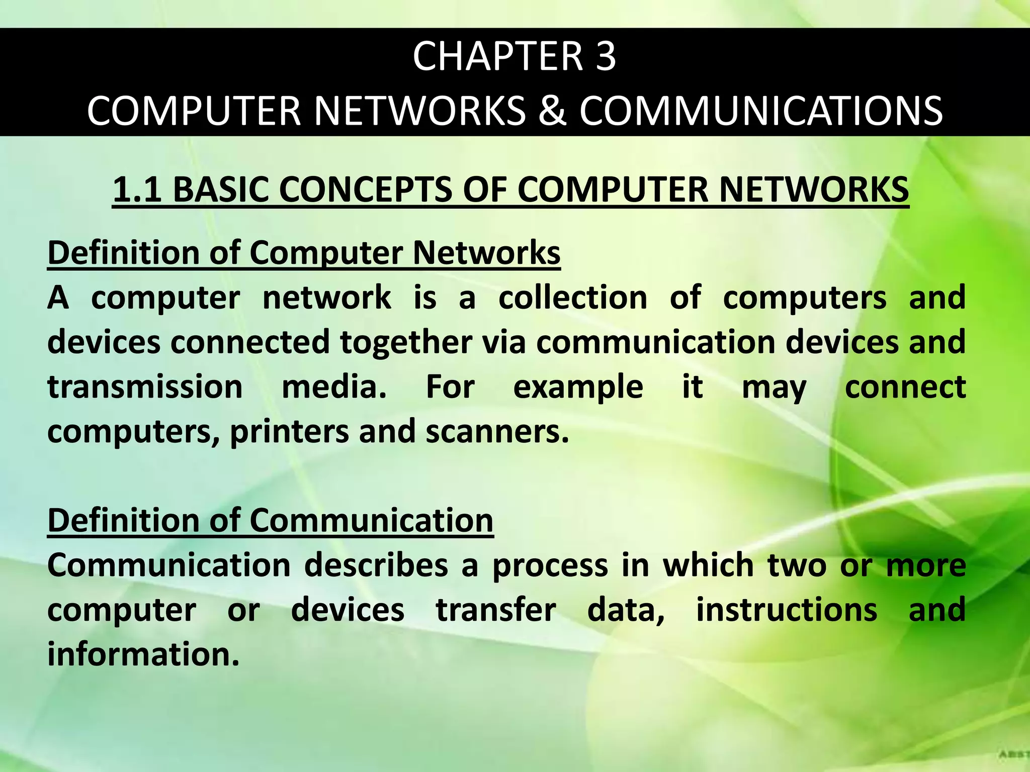 A computer network connects devices together through communication devices and transmission media. TCP/IP is a common network protocol that defines how messages are routed between devices. Common network topologies include bus, star, and ring configurations. Hardware like network interface cards, hubs, routers, and switches facilitate device connections. Wireless technologies like WiFi and Bluetooth allow for device communication without cables.