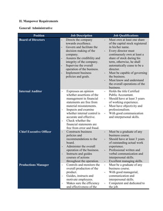 2) Details on manpower requirements including job descriptions and qualifications for various roles.