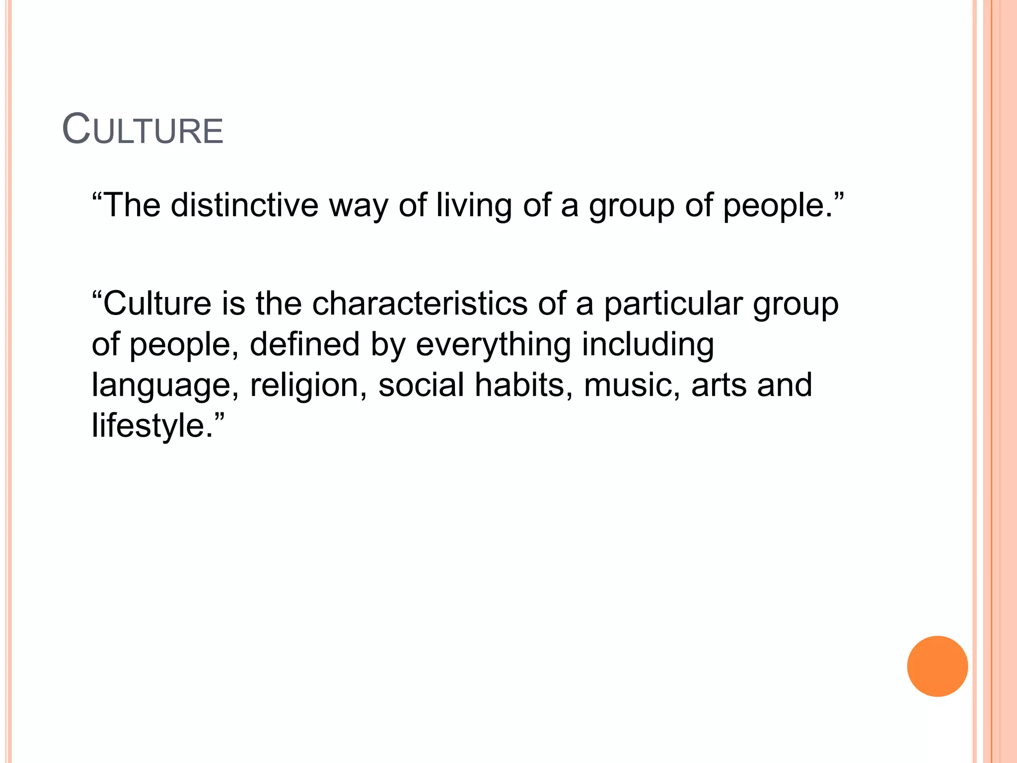 Culture can be defined as the distinctive way of living of a group of people, including their language, religion, habits, arts, and lifestyle. Culture has both material and nonmaterial aspects. Material culture includes physical items like tools and buildings, while nonmaterial culture consists of ideas, beliefs, and behaviors. Cultures share characteristics like being learned, socially shared, adaptive, integrated, and prescriptive. They provide individuals with a sense of identity and purpose through shared values, norms, and rituals. However, cultures also differ in small but important ways between various national and regional groups.