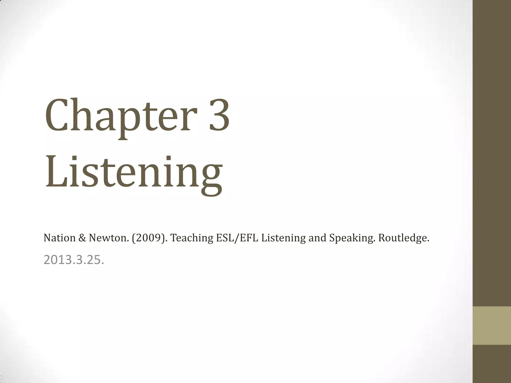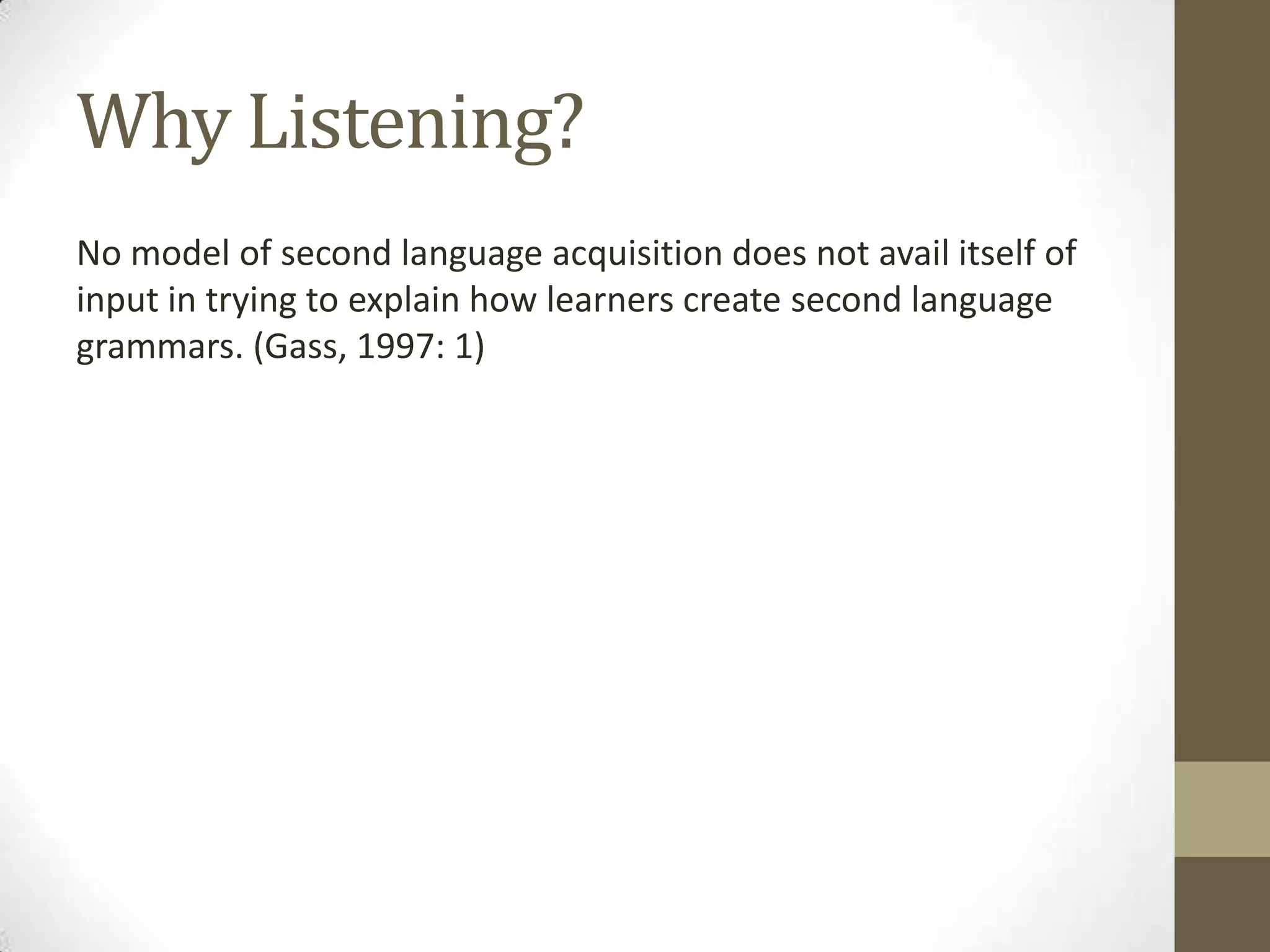 This document discusses listening as an important part of second language acquisition. It argues that listening provides input that allows learners to build a "cognitive map" of meaning in their mind, which may be more important than speaking practice alone. There are two main types of listening discussed: one-way transactional listening and two-way interactional listening. Successful listening relies on both bottom-up processing of linguistic elements as well as top-down processing using prior knowledge and schemata. The document outlines several specific listening challenges and provides suggestions for practice, including working with reduced forms, assimilation, elision, and resyllabification.