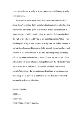 Counterfactual thinking involves imagining alternative outcomes for events that have already occurred. It is categorized into upward counterfactual thinking, which imagines a better outcome, and downward counterfactual thinking, which imagines a worse outcome. The document describes two personal experiences that illustrate each type of counterfactual thinking. The first involves a friend getting caught cheating on an exam, where the author imagines being able to help faster. The second involves the author getting caught trying to skip school, where they imagine their mother not scolding them in front of teachers. Both experiences led the author to conclude they involved the respective types of counterfactual thinking.