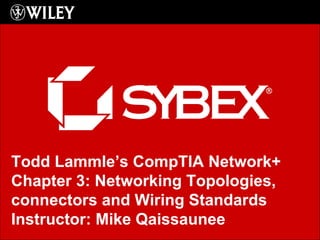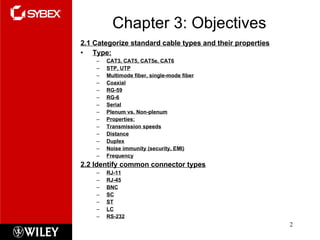 The document discusses various networking topologies, cable types, connectors and wiring standards. It covers standard cable types like CAT3, CAT5, CAT5e, CAT6 and their properties. Common connector types like RJ-11, RJ-45, BNC and SC are identified. Wiring standards like 568A and 568B are explained. Different physical media like coaxial cable, twisted pair cable and fiber optic cable are described in detail.