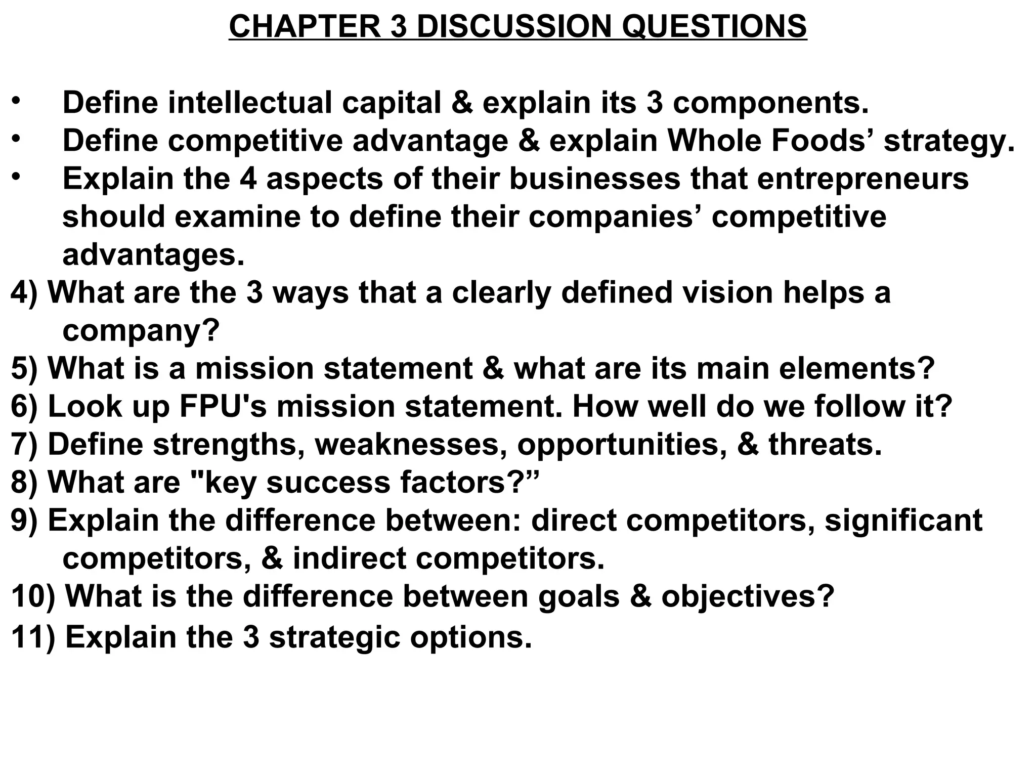 The document defines several key business strategy concepts. It explains that intellectual capital has three components: human capital, structural capital, and customer capital. It defines competitive advantage as factors that allow a company to outperform competitors. Whole Foods' competitive advantages include its employees' passion for food and customer service. The document also discusses the differences between goals and objectives, and the three strategic options of cost advantage, differentiation advantage, and focus.