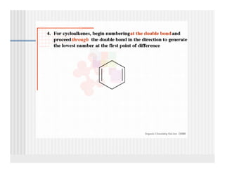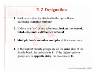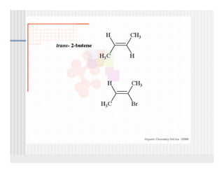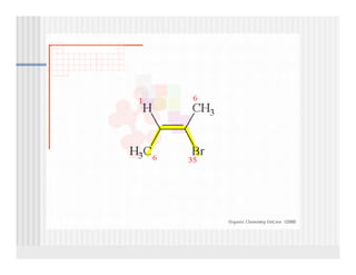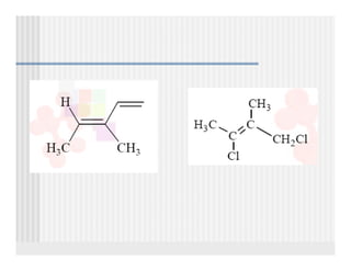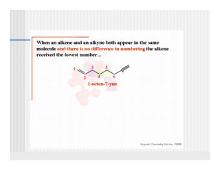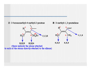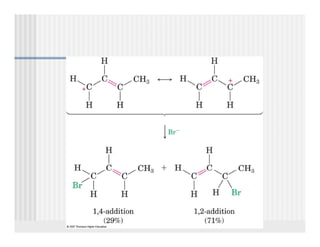 This document provides an overview of alkenes and alkynes reactions. It discusses addition reactions of alkenes including hydrohalogenation, hydration, halogenation, hydrogenation, oxidation, and polymerization. It also covers conjugated dienes, the Diels-Alder reaction, and drawing resonance forms. For alkynes, the document discusses reduction, addition reactions, hydration, oxidative cleavage, acidity, and acetylide anion formation and reactions.