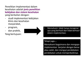 Riset implementasi dalam kesehatan merupakan studi tentang kebijakan dan sistem kesehatan yang bertujuan untuk memahami keberhasilan dan tantangan dalam implementasi intervensi kesehatan. Ini melibatkan analisis faktor-faktor yang memengaruhi implementasi, strategi pemecahan masalah untuk meningkatkan akses, dan pengukuran hasil implementasi untuk menilai efektivitasnya. Riset ini relevan di berbagai domain dan berfokus pada penerapan intervensi melalui berbagai strategi yang berbeda.