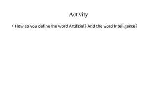 The document provides an overview of artificial intelligence (AI), including definitions, components, types, applications, and levels. It defines AI as using computer science to create intelligent machines that can behave and think like humans. Intelligence involves reasoning, learning, problem-solving, perception, and language understanding. AI systems are composed of agents that perceive their environment and act on it. Examples of AI applications include autonomous vehicles, medical diagnosis, games, and online assistants. Machine learning is an advanced form of AI that allows machines to learn from experience rather than being explicitly programmed. The document also discusses the history of AI and describes six levels and two main types.