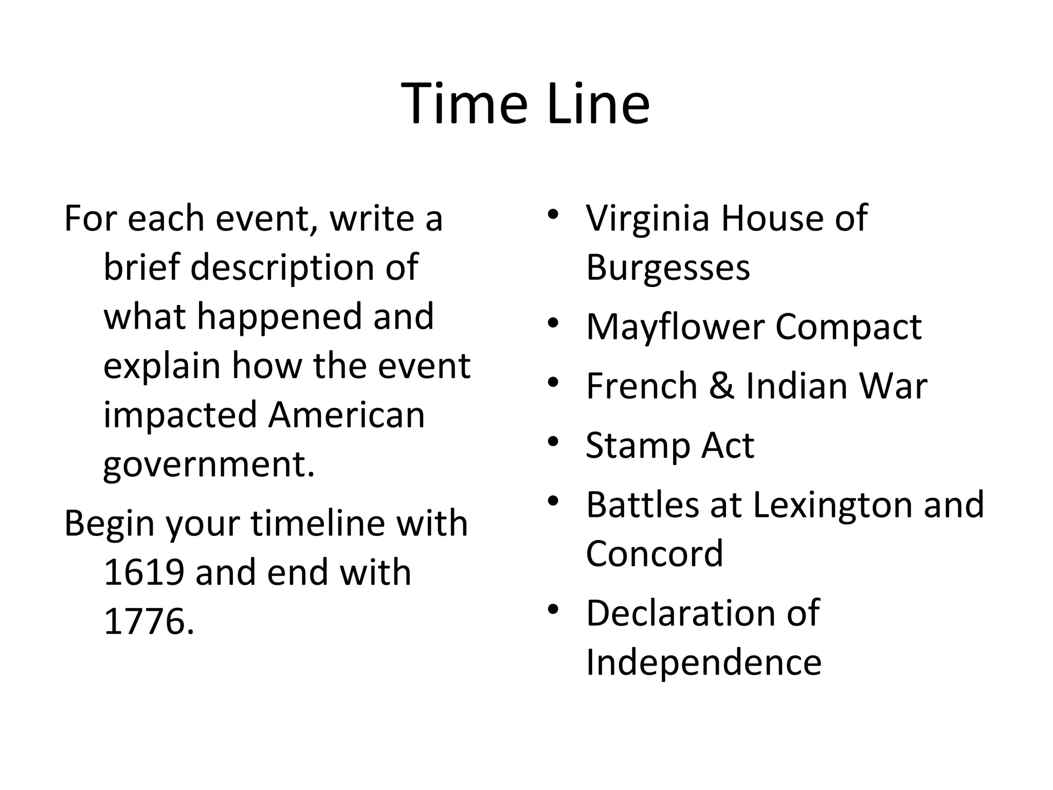- Virginia House of Burgesses established in 1619, laying the groundwork for representative government in the colonies. The Mayflower Compact of 1620 established self-government for the Plymouth colony. The French and Indian War in the 1750s led the colonies to realize the need to unite.