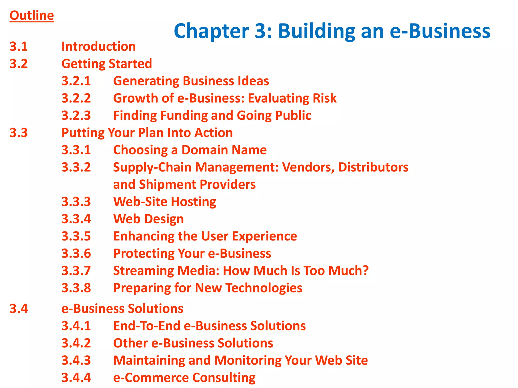 Chapter 3 provides a comprehensive overview of building, managing, and developing an e-business, covering aspects such as generating business ideas, risk evaluation, funding, and effective web design. It emphasizes the importance of a solid business plan, supply chain management, user experience enhancement, and robust website operations. The chapter also discusses various e-business solutions, including end-to-end service providers, and highlights the need for continuous adaptation to new technologies and market changes.