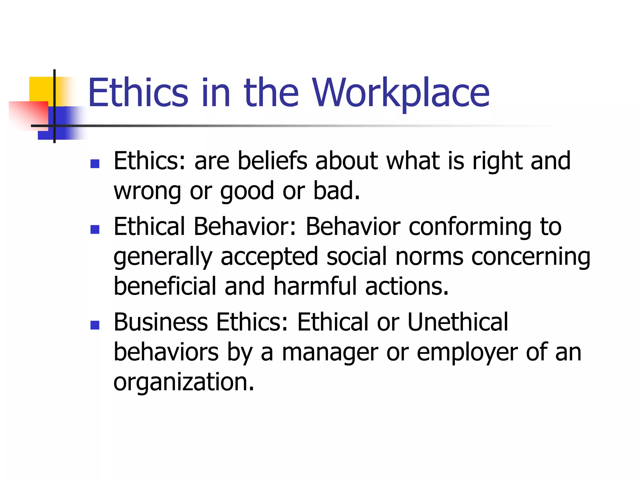 This document discusses business ethics and social responsibility. It defines ethics and ethical behavior, and explains that business ethics refers to ethical or unethical behaviors by managers and employers. It also describes three categories of managerial ethics: behaviors toward employees, the organization, and other economic agents. Additionally, it outlines the stakeholder model of responsibility toward customers, employees, investors, suppliers, and local communities. Finally, it discusses areas of social responsibility including the environment, customers, and employees.