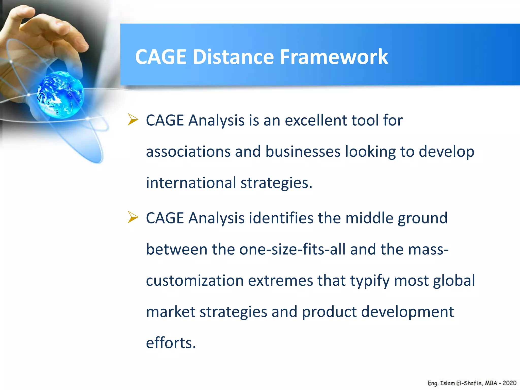 The CAGE framework analyzes four dimensions - cultural, administrative, geographic, and economic distance - to help businesses develop international strategies. It identifies a middle ground between one-size-fits-all and highly customized global strategies. Using CAGE, businesses can assess market potential and risks in different countries, eliminate guesswork in market entry order, and identify products suitable for international markets. The cultural dimension examines differences in language, ethnicity, and values. The administrative dimension refers to laws, policies, and trade agreements. The geographic dimension impacts transportation costs and product delivery. The economic dimension considers differences in market size, resources, and infrastructure.