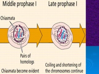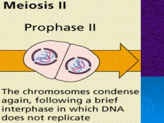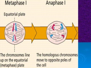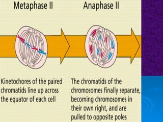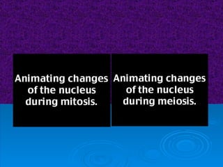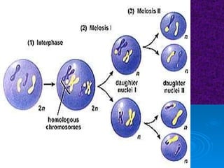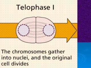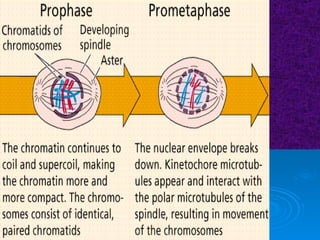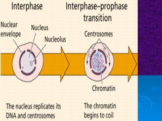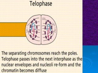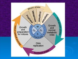 The document summarizes cell division and the two main types: mitosis and meiosis. Mitosis produces two identical daughter cells and is used for growth, repair, and replacement of somatic cells. It involves the phases of interphase, prophase, metaphase, anaphase, telophase, and cytokinesis. Meiosis produces four non-identical gamete cells through two rounds of division and is involved in sexual reproduction.