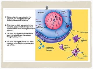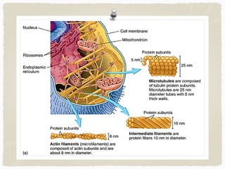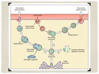 The document provides information on cell structures and their functions. It discusses the cell theory, which states that all organisms are composed of cells, cells are the basic unit of structure and function, and all cells come from preexisting cells. It then describes several key organelles and their functions, including the nucleus that houses DNA, mitochondria that generate energy, and lysosomes that digest waste. The document concludes by explaining the process of mitosis, how it results in two identical daughter cells through nuclear division and cytokinesis.
