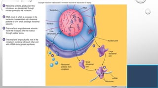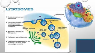 The document summarizes key aspects of cell structure and function. It describes cells as the basic unit of life and outlines several organelles and their functions, including the cell membrane, nucleus, mitochondria and lysosomes. It also explains the process of cell division through mitosis, where a parent cell replicates its DNA and other components before dividing into two identical daughter cells through the phases of interphase, prophase, metaphase, anaphase and telophase.