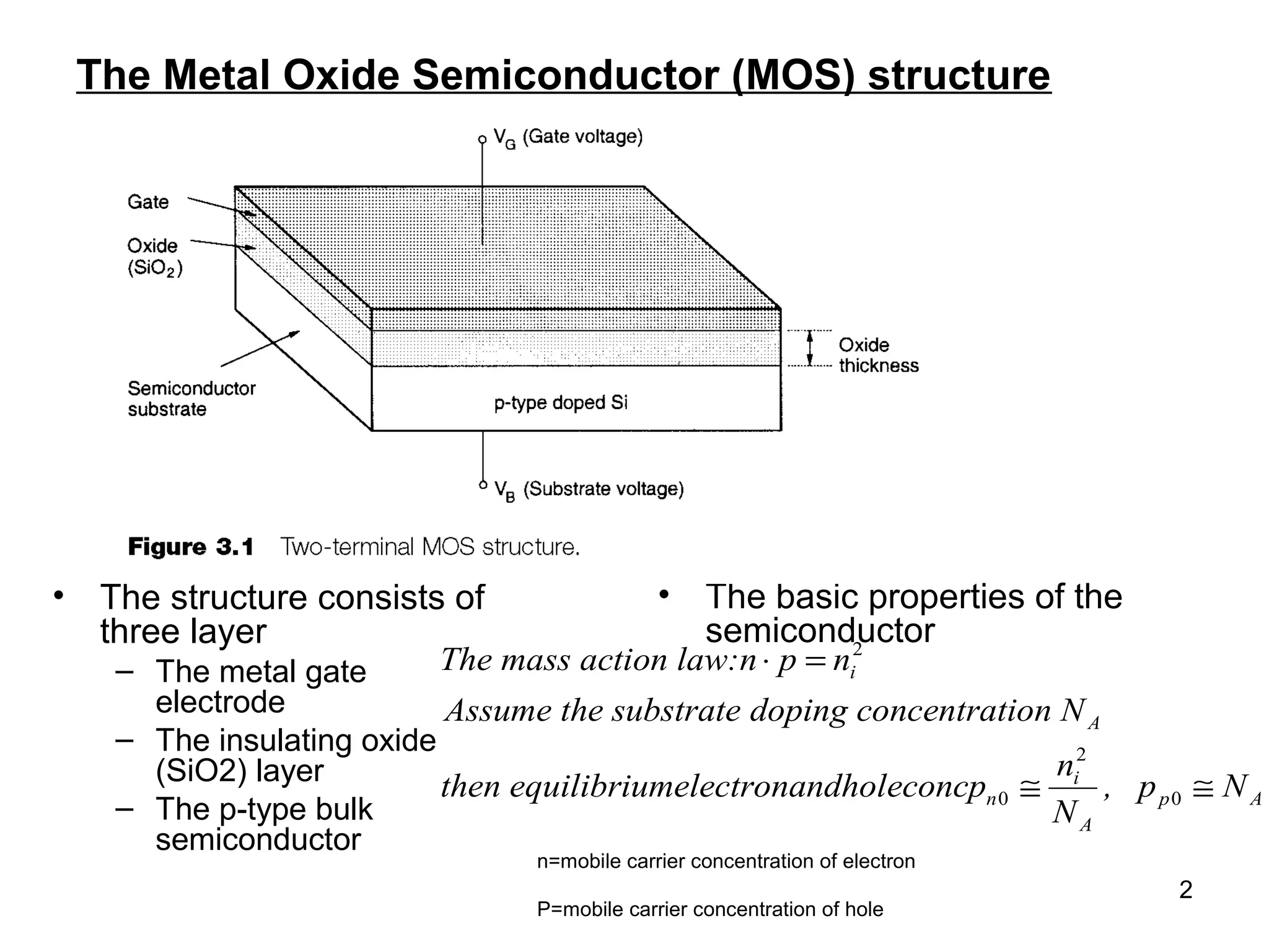 The document discusses the MOS transistor structure and its operation. It begins by describing the basic MOS structure consisting of a metal gate, oxide layer, and semiconductor substrate. It then explains the energy band diagrams and how applying different gate biases can cause accumulation, depletion, or inversion at the surface. The document also covers MOSFET operation in different regions, the gradual channel approximation used to derive current equations, threshold voltage, channel length modulation, and the effect of substrate bias.