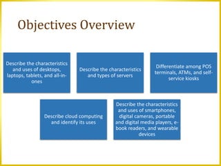 This document discusses various computer and mobile devices, including their characteristics and uses. It covers desktops, laptops, tablets, smartphones, digital cameras, portable media players, servers, terminals, cloud computing, game devices, embedded computers, ports and connections. The document also addresses protecting hardware from theft or damage and health concerns related to technology use.